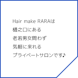 Hair make RARA(ヘアメイク ララ)は、鹿児島市樋之口町にある、完全予約制のプライベートサロンです。